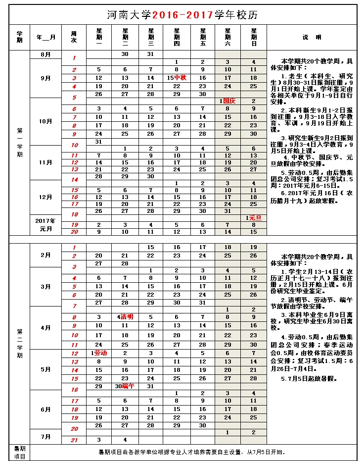 河南大学2016-2017学年校历